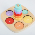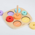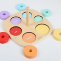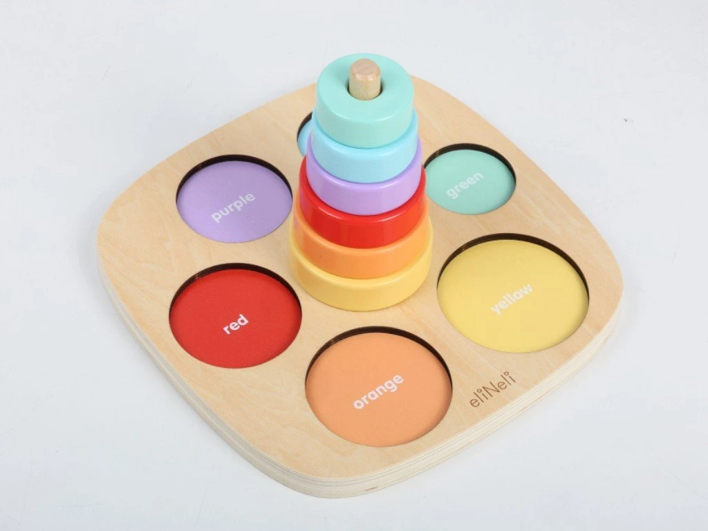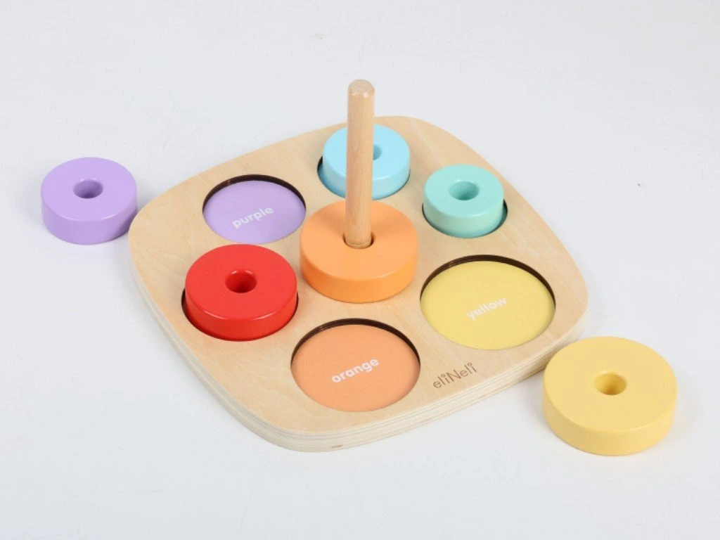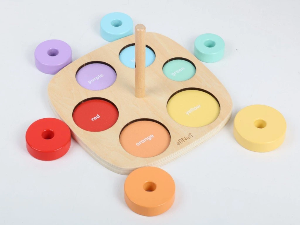 Dřevěná vkládačka a nasazovačka v jednom je ideální pomůckou pro zábavné učení a rozvoj dětských dovedností. Děti si hrou osvojí barvy a naučí se rozeznat různé velikosti. Při navlékání kroužků mohou začít s prvními počty a hravou formou rozvíjí jemnou motoriku i logické myšlení. Najdou tu také první anglická slovíčka (názvy barev), která se snadno naučí při společné hře.